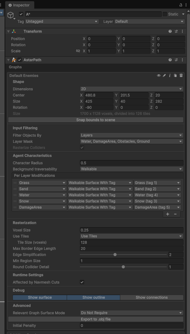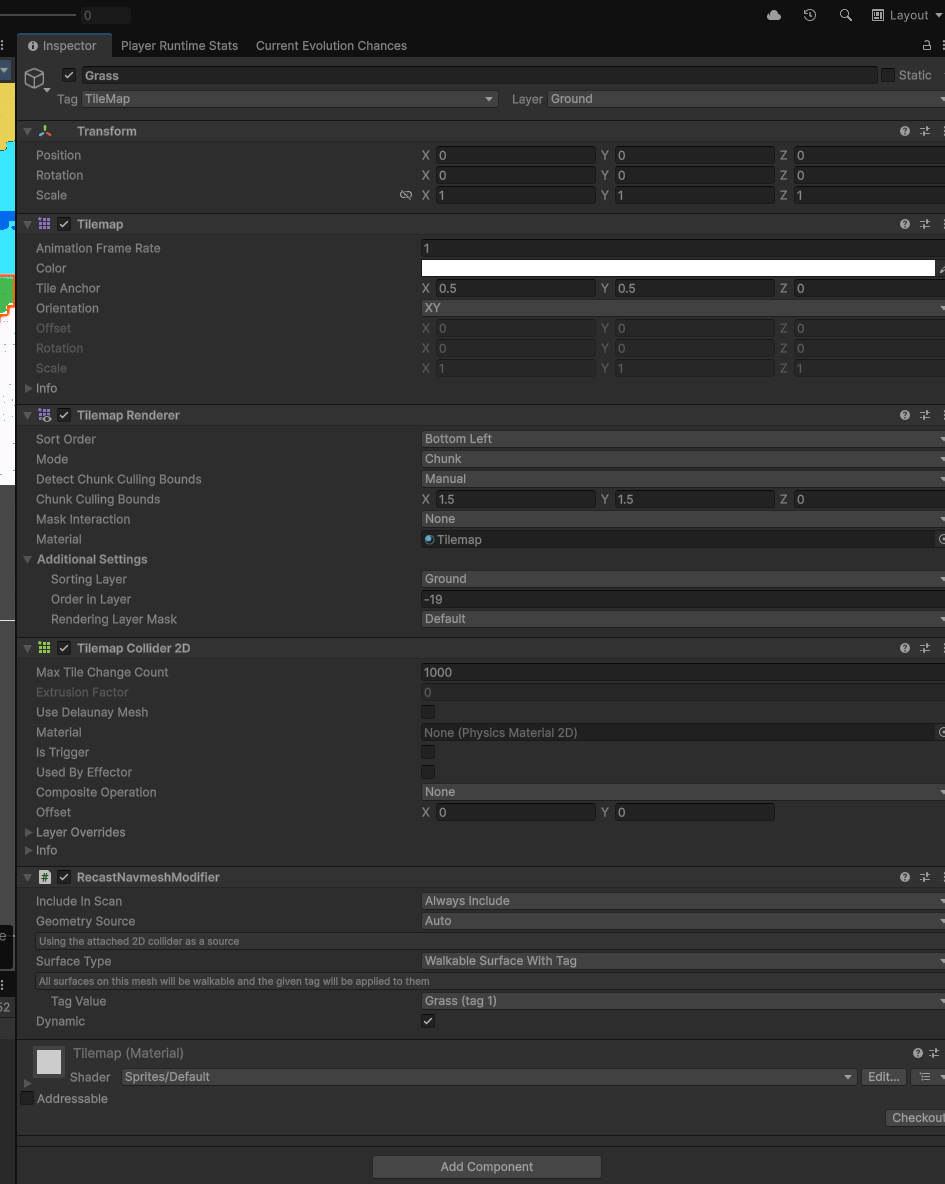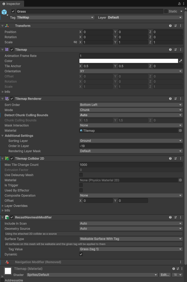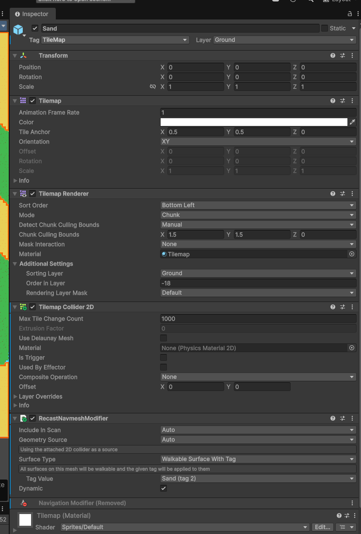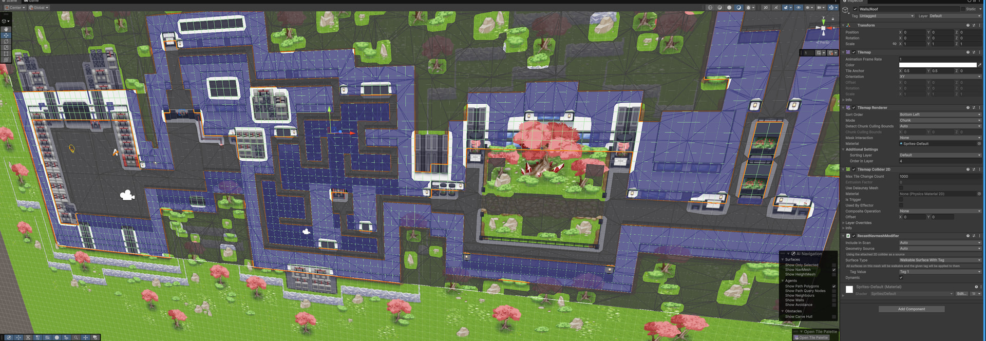 And here’s how the tilemaps look (I’ve tried every combination of with TilemapCollider2D, RecastNavmeshModifier and nothing causes it to show up)