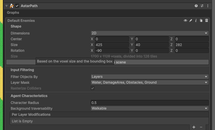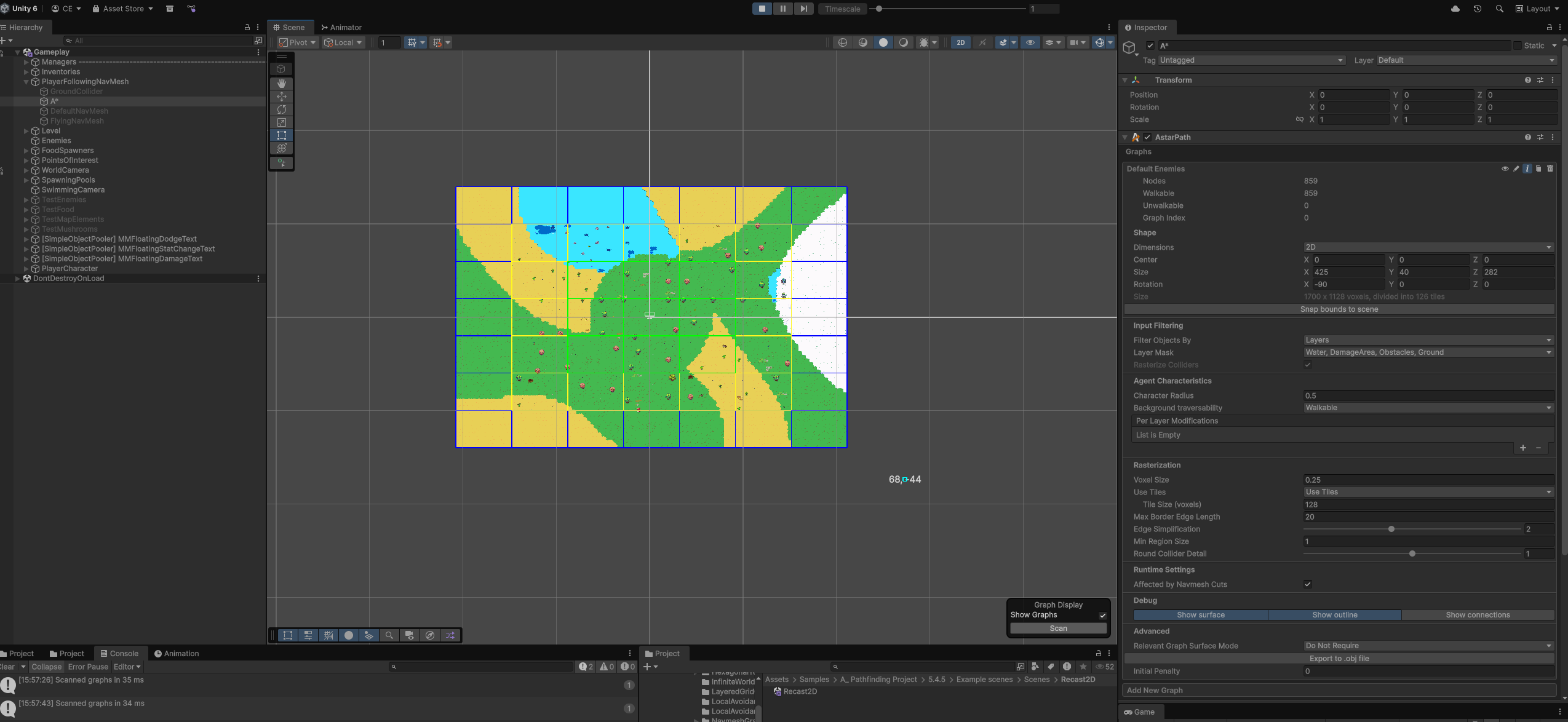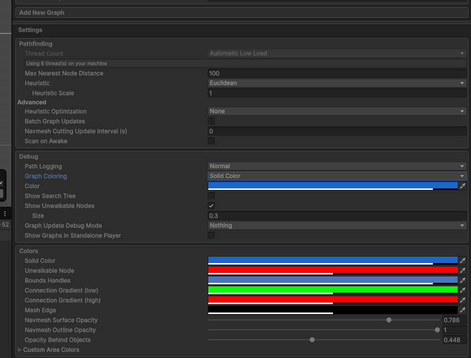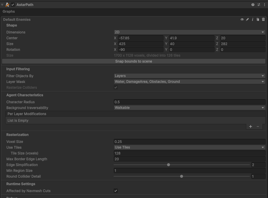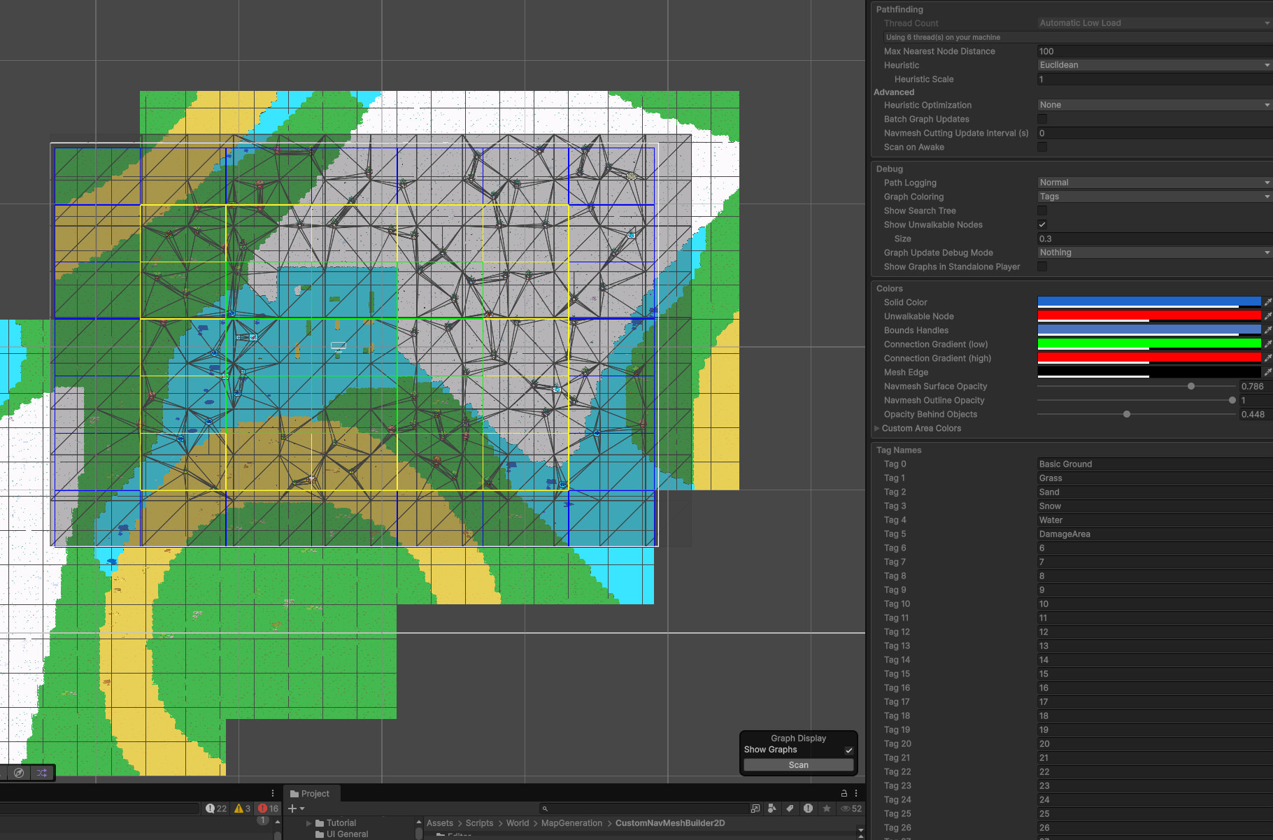 I have a single Recast Graph for now (2D) and it tends to find the map object colliders (e.g. trees, rocks etc.) well enough. However no matter what I’ve tried, I cannot get it to take the tiles that exist on each of the tilemap layers (separate GameObjects for each terrain type) and make them show up in the generated NavMesh with the proper tags (or at all even without tags).