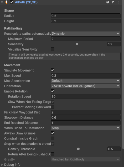 Each NPC: AIPath + Rigidbody (non-kinematic, Use Gravity enabled, no Freeze Position constraints) + Box Collider