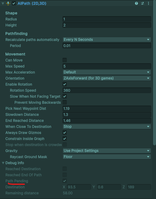 Which results in ‘true’ but that should not be the case. The new destination is far away. I’m guessing the seeker component didn’t calculate the new path properly?. Due to this, the agent never moves to the second destination but instead it drops the item right from the first destination. Right now, I’m adding a timer of 3 seconds after change destination and setting can move to true again to avoid this bug and that solves the issue. So right after setting the target, wait 3 seconds and then check if AIPath.remainingDistance <= AiPath.endReachedDistance. Here’s my complete script. Refer to the update loop.