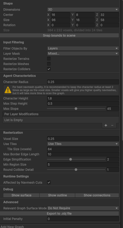 Hello! In our game we need to rescan graph because we have dynamic environment, that can be destroyed, and with this settings rescan time is huge, around 300 ms, and same settings in unity navmesh is around 15 ms, so difference is 20! times. What we doing wrong and how we can optimize rescan time? We can’t increase size of voxels. Thanks!`while (updateGraph)