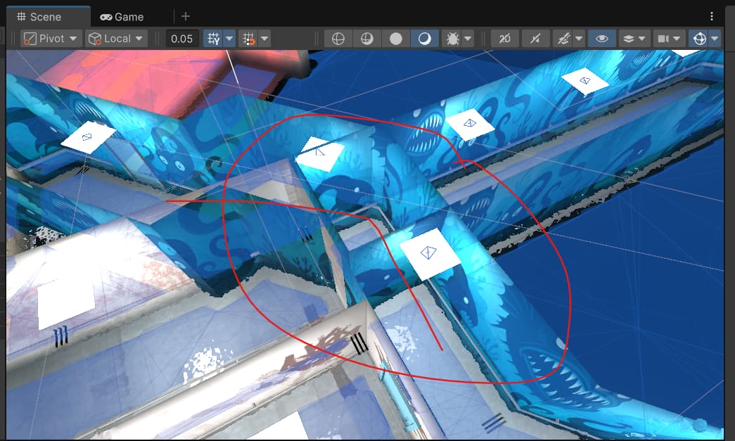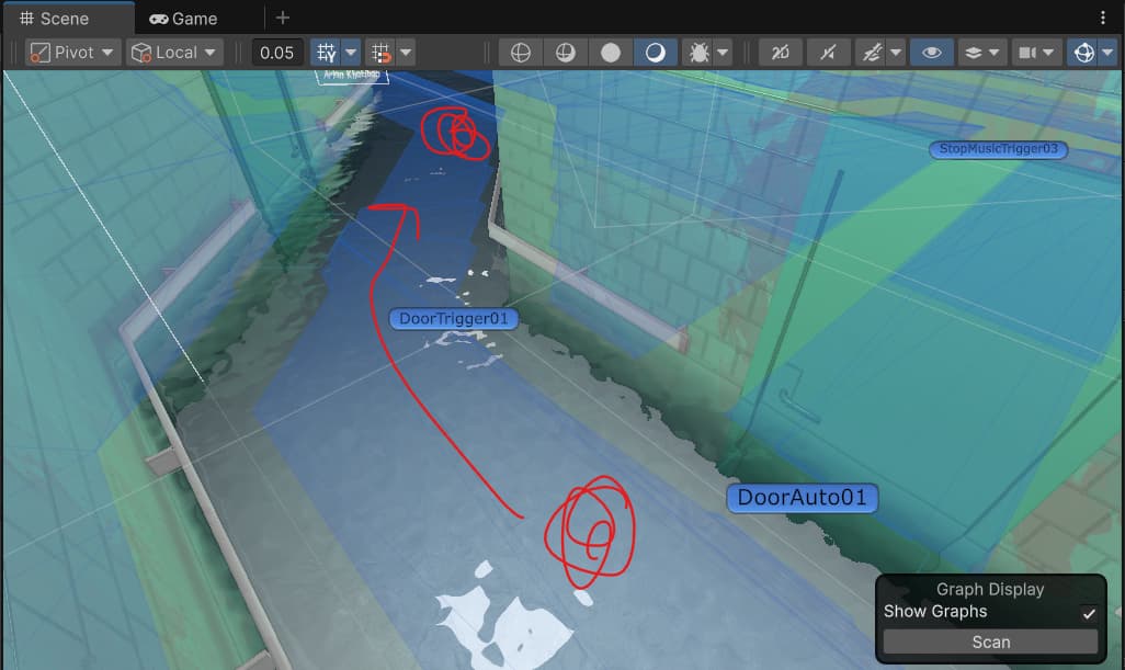 The thing is, I have a couple of hallways that intersect with each other, and I need to scan them in runtime. I know that there are other ways, like scanning only a bounds area, but I wanted to scan the whole graph, which is made up of 7 raycast graphs, each for an aisle, but even when I run a SyncScan on the hallway, that does not change; this glitching is happening.