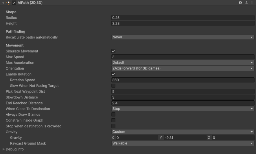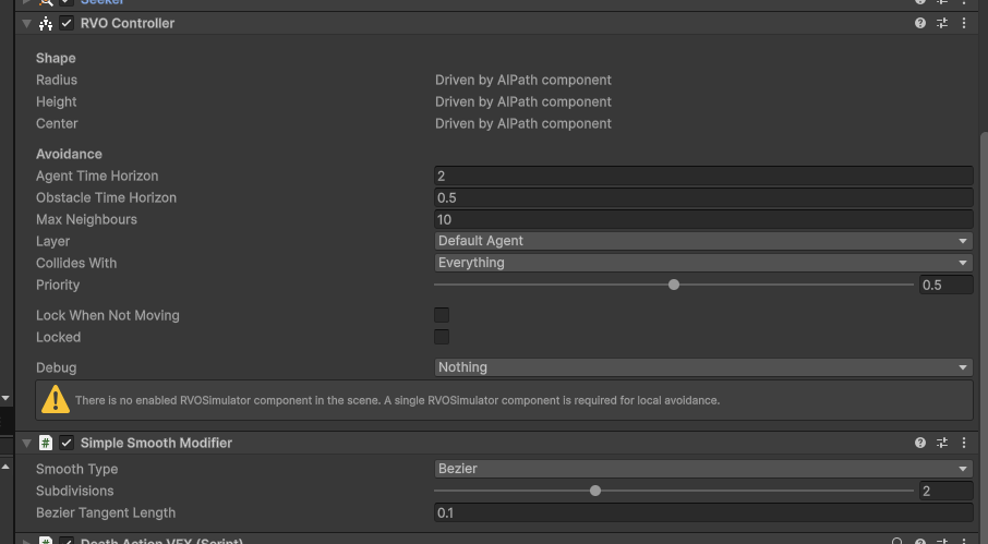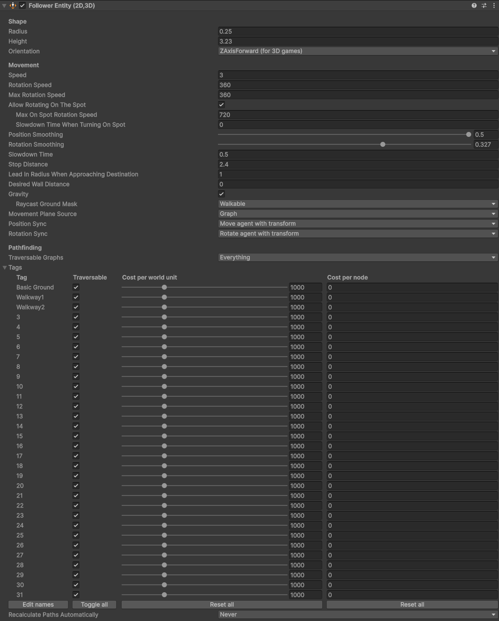 In the screenshot above the capsule cannot get to the center square here. With the AIPath component implementation the agents will basically cut through the cubes to get there but with the follower entity they’re stopping where you see the capsule and gizmos. For the most part the settings are identical before and after, though there are some additional settings on the FollowerEntity I don’t know I’ve accommodated for correctly.