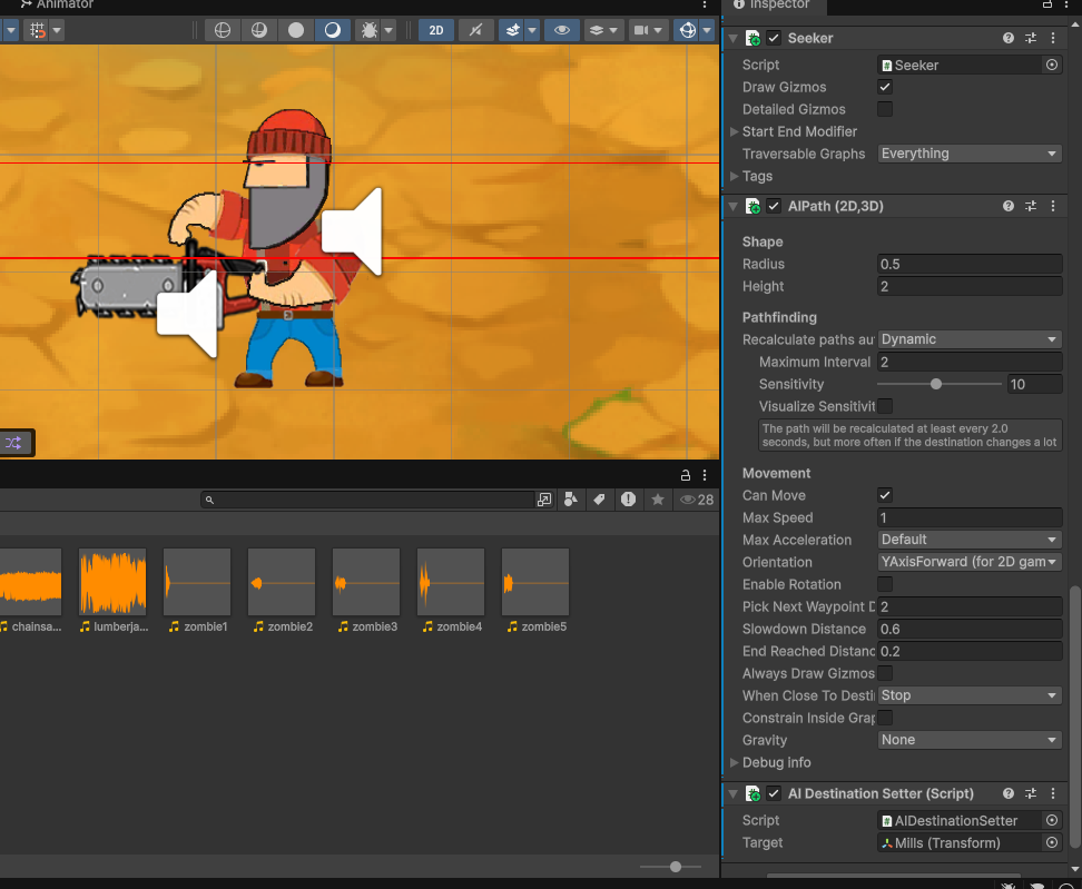 Try to make him move and show me the AIPath component with the Debug Info collapsed