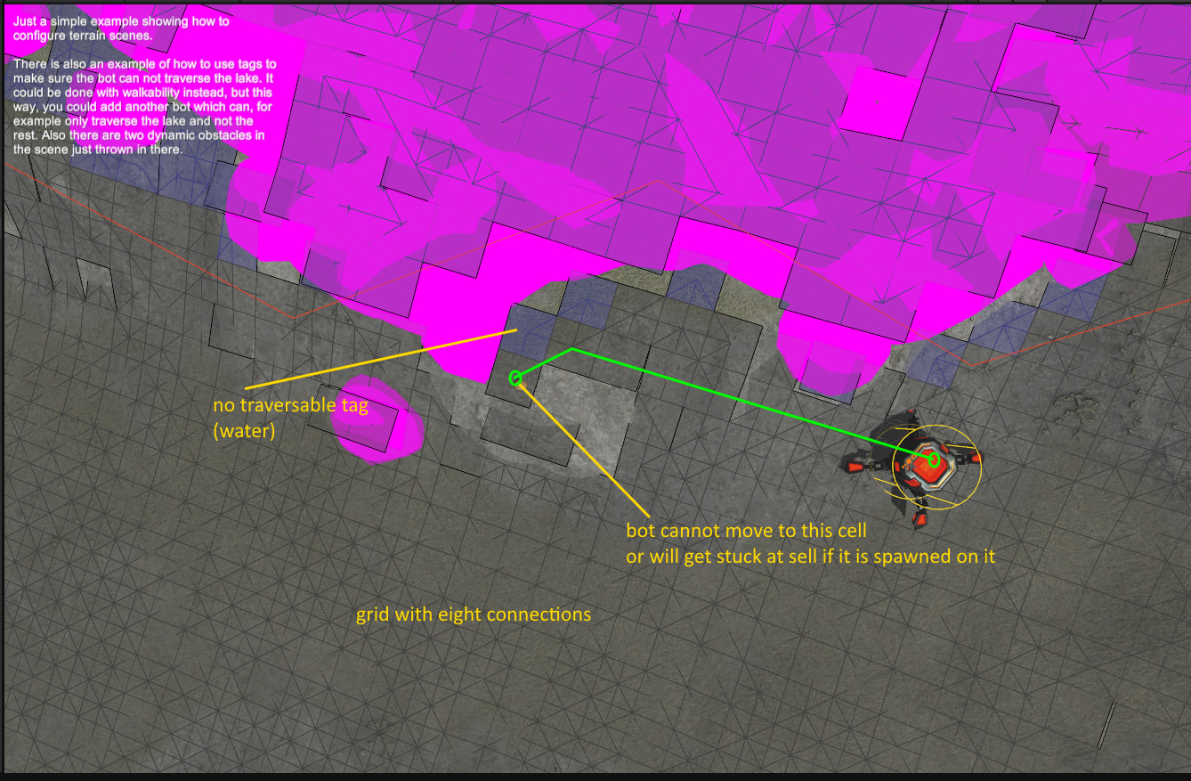 I have a cell on a grid map, and the bot can’t visit it. The graph has eight connections. Shouldn’t it be connected? (also I use GraphUpdateScene to add non traversable “water” cells)