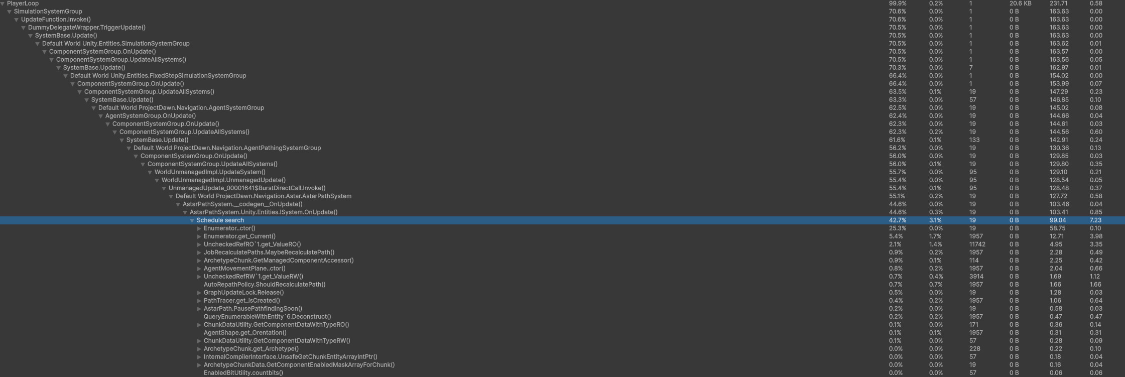 Note that in this particular example, the game is running pretty slowly (due to deep profiling). The FollowerEntity systems have had to resort to run 19 times in a single frame to try to ensure movement is still predictable despite the low frame rate. This makes it seem much more expensive than it actually is at a more reasonable frame rate.