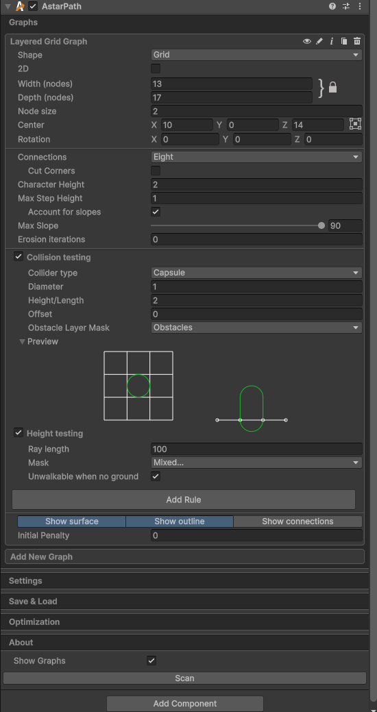 The Layered Grid Graph and my “Game” Grid are inline, I just have an offset of 1 has A* is managing the wall border of the map.