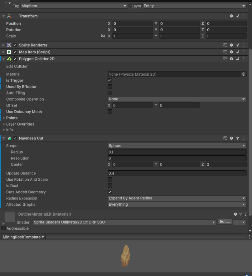 In my game, I have a mining node (a GameObject with a Sprite). When the node is mined, it gets removed from the game. The issue I’m running into is that the collision shape is defined by a polygon, which makes handling Cuting the navmesh process more complicated.