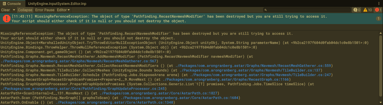 MissingReferenceException: The object of type ‘Pathfinding.RecastNavmeshModifier’ has been destroyed but you are still trying to access it.