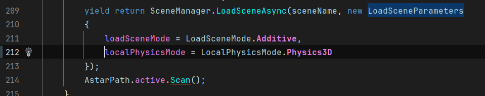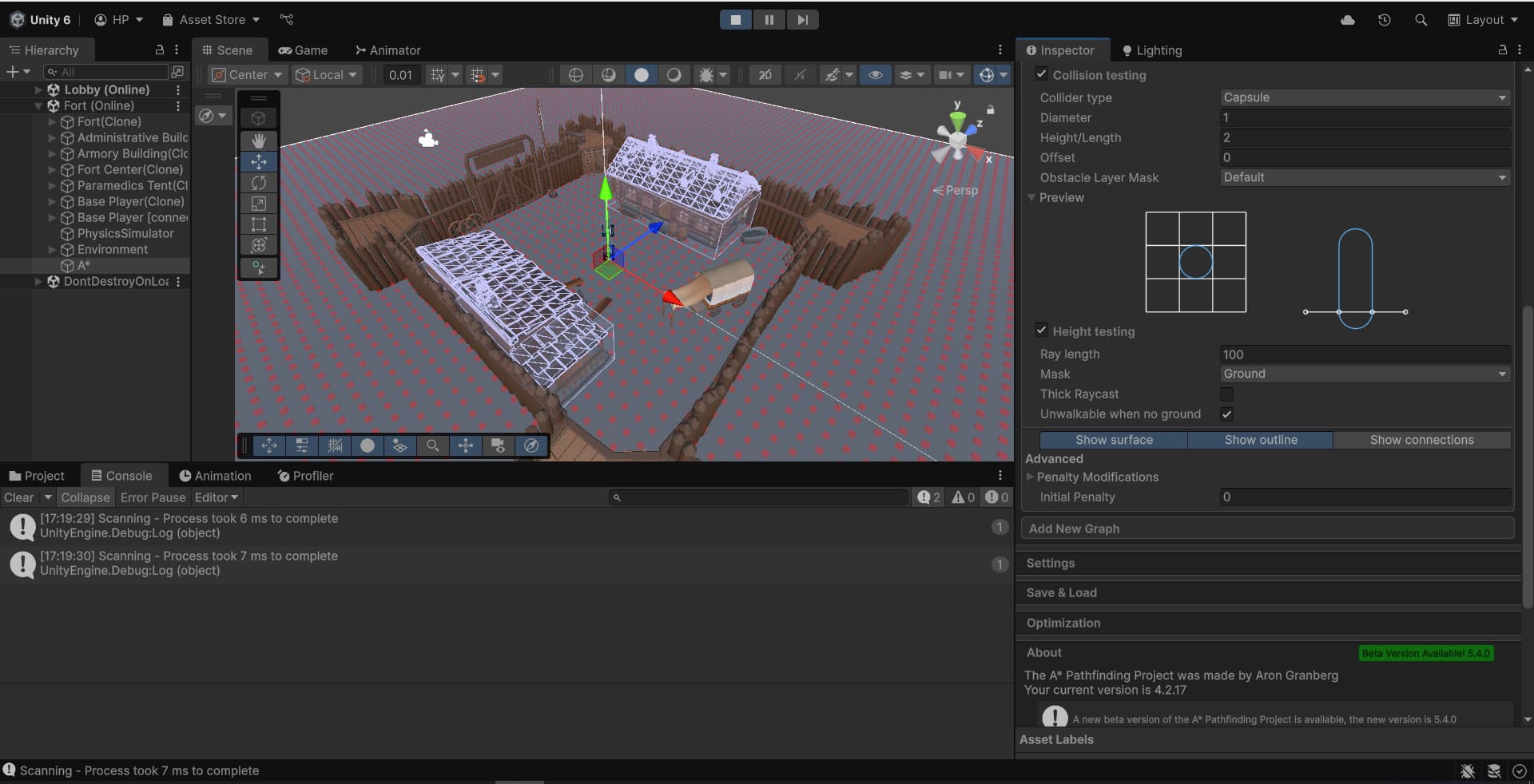 I’m using a grid graph. Collisions are calculated only in the main scene (Lobby), and it doesn’t see the Fort scene (it’s loaded additively). In the Fort scene, physics are calculated separately from other scenes, since I loaded it with the localPhysicsMode.Physics3D setting.